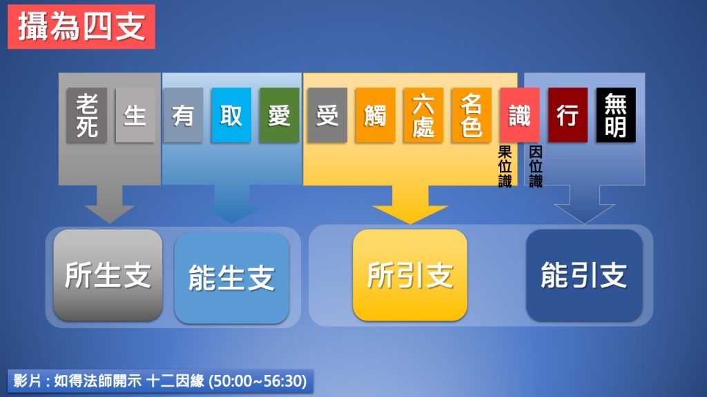 根據《集論》所說,「十二支可略攝為四支,即能引支、所引支、能生支、所生支;『引』是引發,『生』是生起。