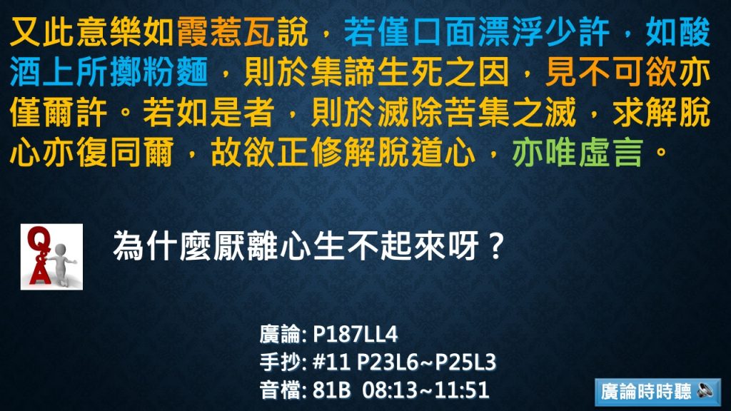 Ans:很顯然,因為管用、實用。如果給我們一個非常非常美的真理,馬上能用在身心上,然後能夠解決問題,我們內心裡一定是很興奮的,覺得很期待,了解了本論的殊勝,會產生一個善法欲。