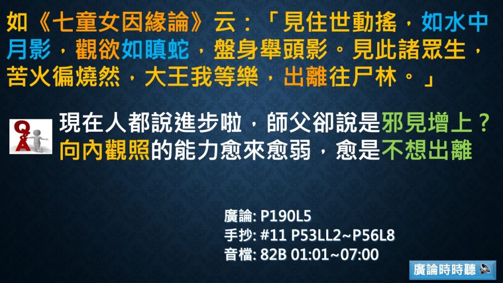 Ans:因為有一個很歡喜地去行持法的基本心態,應該說很陽光、正面的心態,開啟了我們內心中很多的正能量,讓我們慢慢地擺脫負面作意、負面思惟、悲觀的理路。