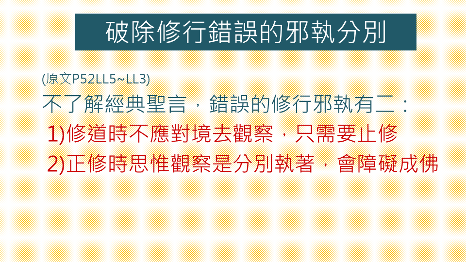 對於沒有善巧學習過、不了解經論就是我們眼前最重要的修行教授的那些人,他們會這樣說:「真正修道的時候,心不要動,不應該對境去觀察,應該止修,因為觀察是在聽聞思惟時所做的。」