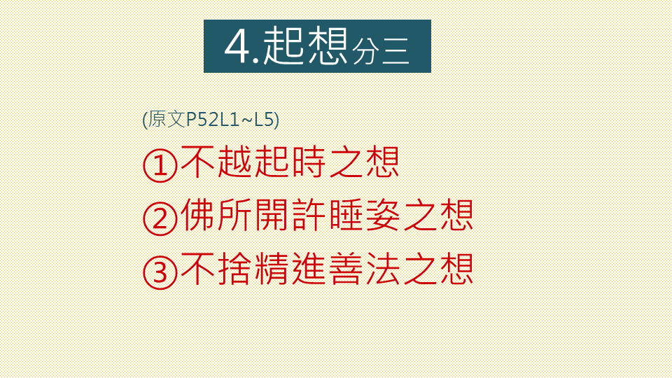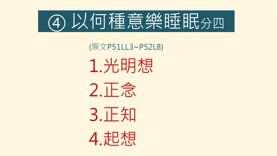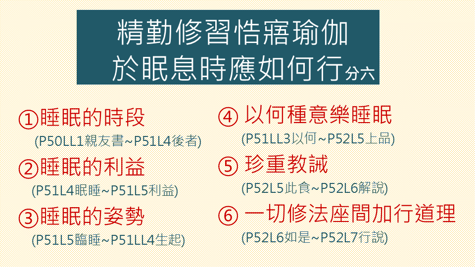 睡眠的姿勢:洗足入內,右脅而臥(有何好處?),重疊左足於右足上,猶如獅子而正睡眠。