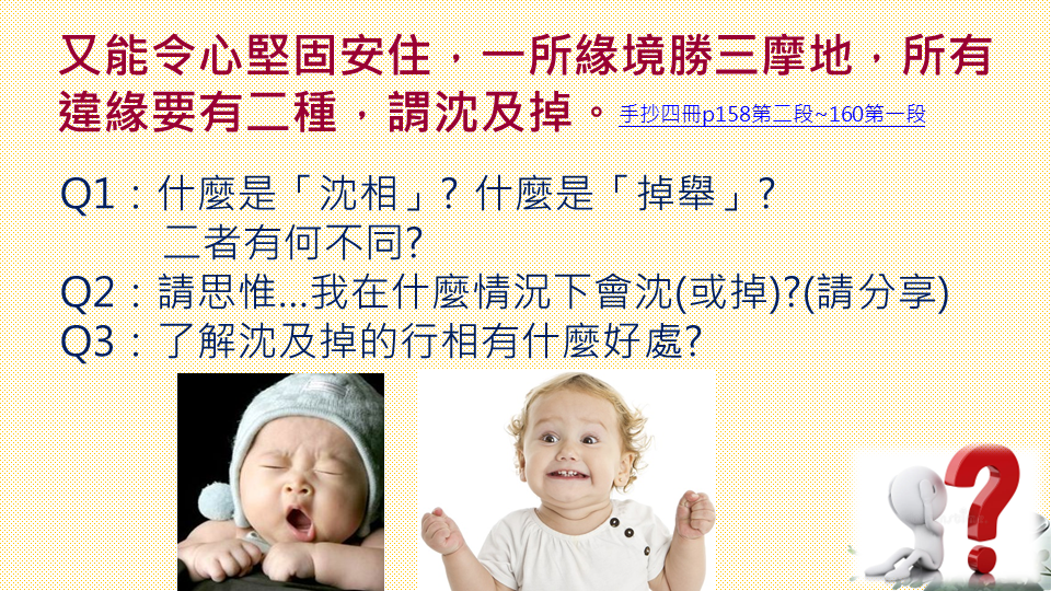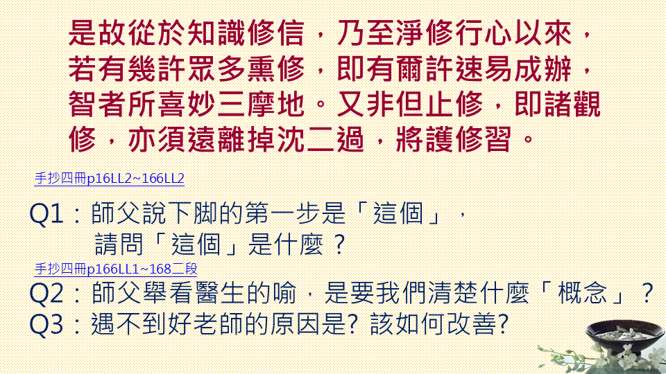 1)對初修學定者,以前沒有學過定,正修時心則要專一貫注於所緣的三摩地上面,大師承許這樣是對的。(對的見解)